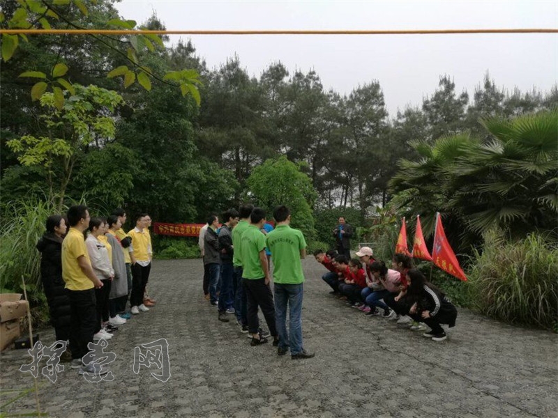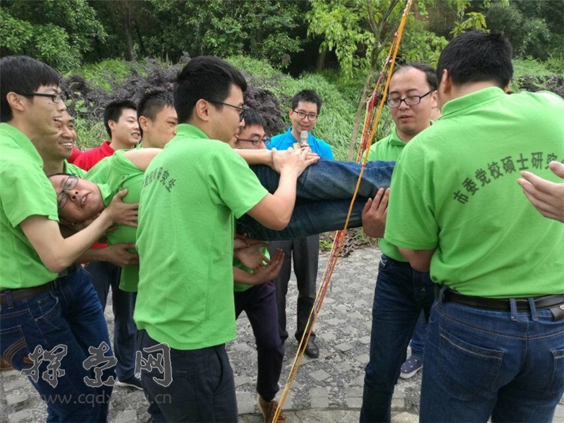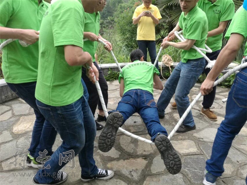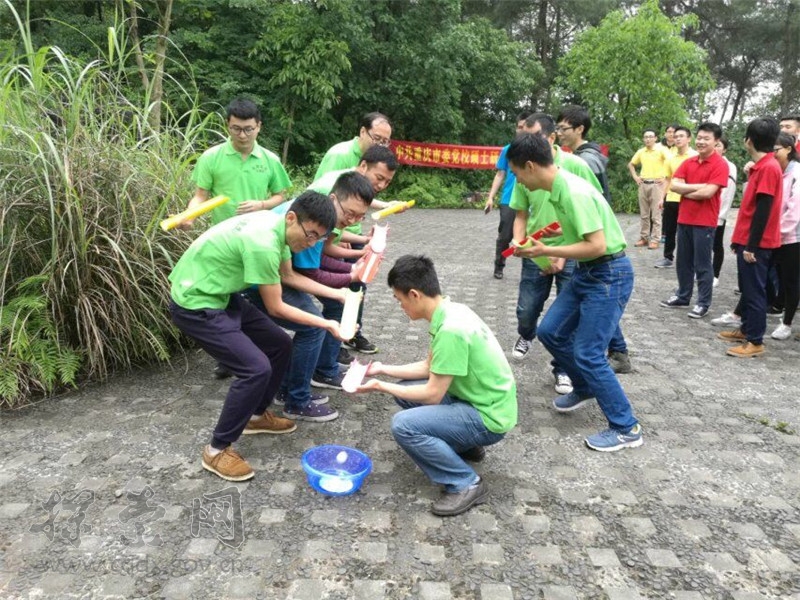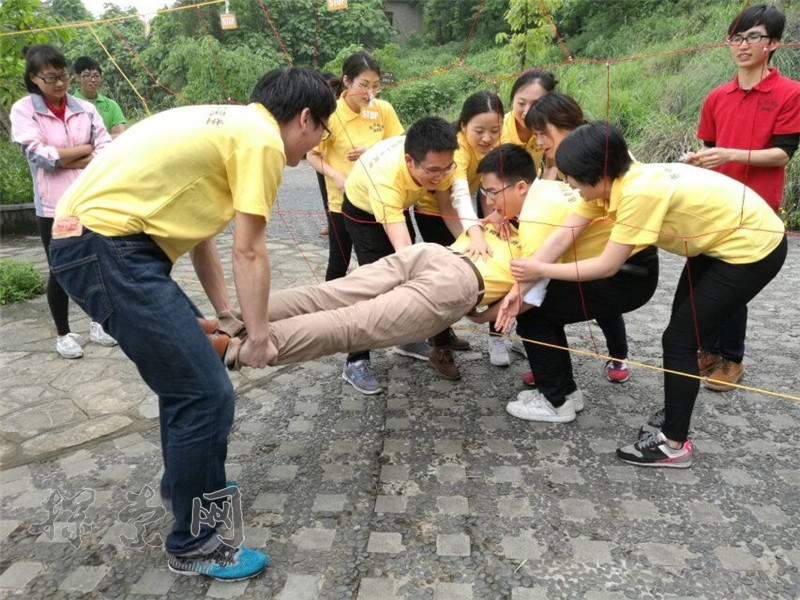 每队9人,其中1名队员饥渴过度,急需饮水,现有两根绳子,附近3米雷区有一瓶水,队友通过两根5米长的绳子成功从雷区取到水挽救了队友生命。用时最少的团队胜出。