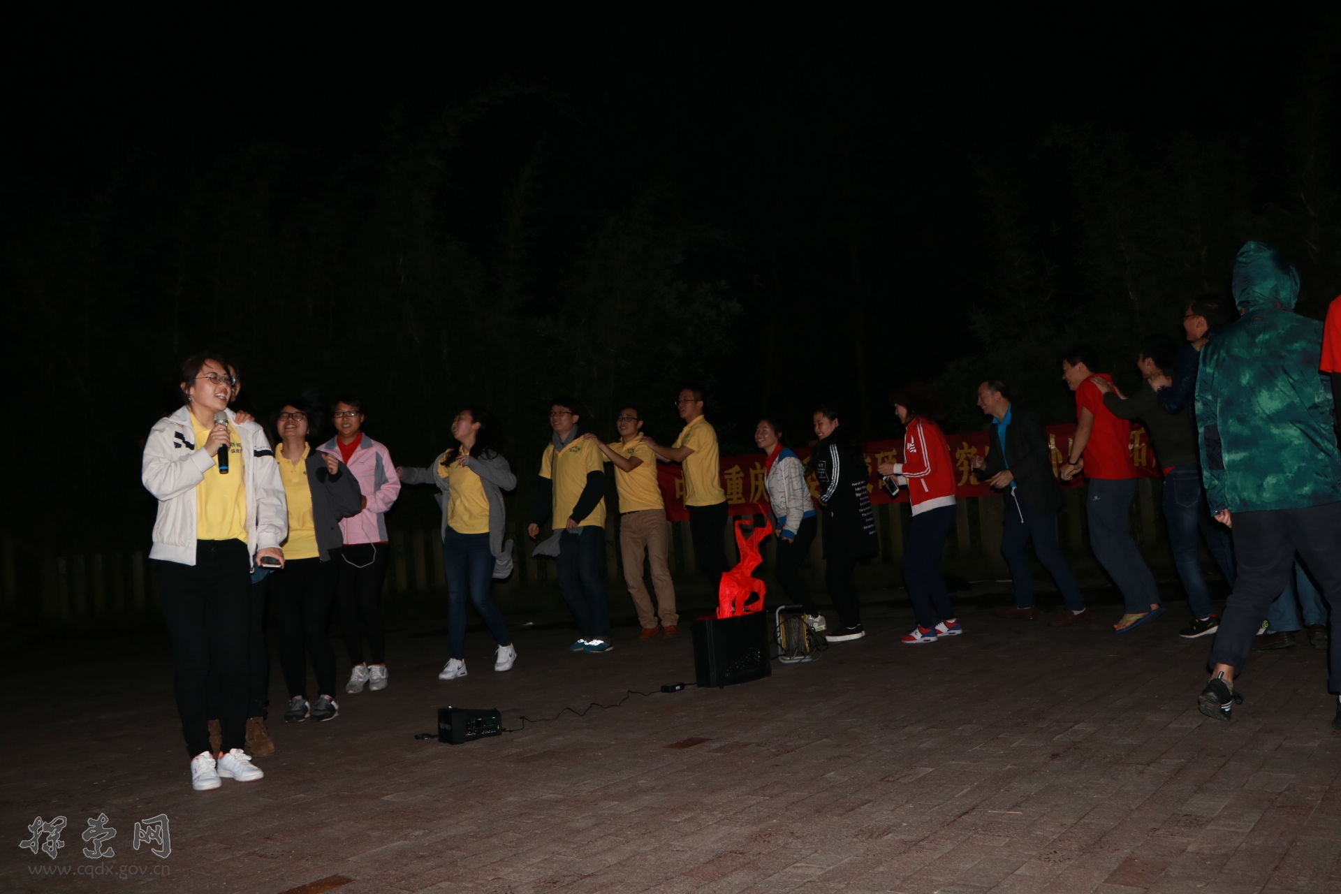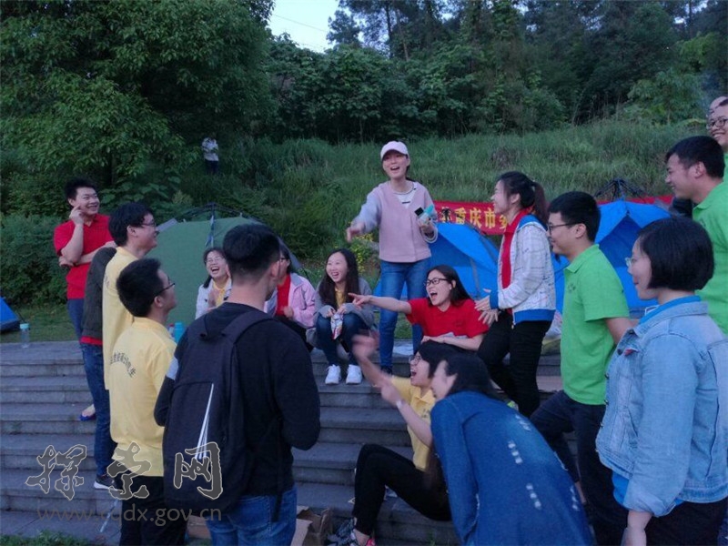 晚上8点,天空放晴,残阳如血,各队载歌载舞,相声表演趣味盎然。就连其他游客也被我们的气氛所感染,情不自禁加入到我们的队伍当中,一首《革命人永远是年轻》唱出了他们的年轻态。快乐的时光总是很短暂的,不知不觉中已到深夜,大家仍意犹未尽。深蓝的天空中挂着一轮金黄的圆月,郁郁葱葱的森林倒映在波光粼粼的江水之中,在与大自然最亲密的接触中进入梦乡,这一切静谧而美好。