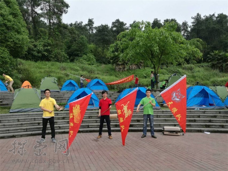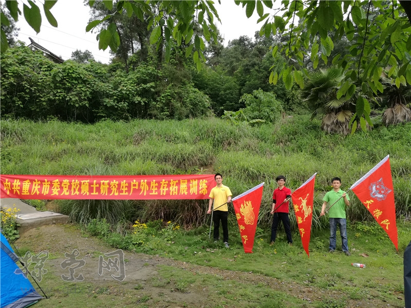 5月11日下午5点,细雨霏霏,渝北区铁山坪森林公园露营基地三面鲜红的印有“猛虎”、“天狼”、“麒麟”字样及图案的队旗在微风中迎风飘扬。这里即将举行中共重庆市委党校硕士研究生户外生存拓展训练。
